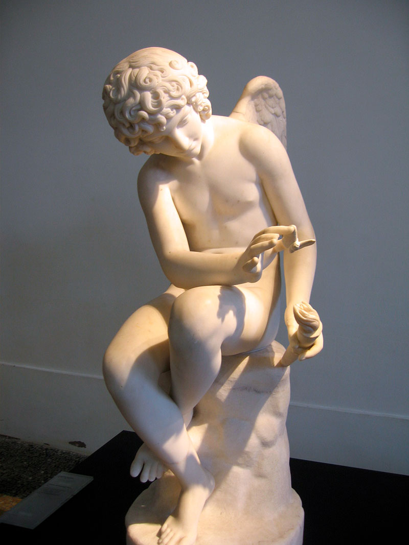 L’Amour tourmentant l’âme (1877). Un jeune amour nu, assis, approche une torche d’un papillon. Réalisé pendant son séjour à Rome.