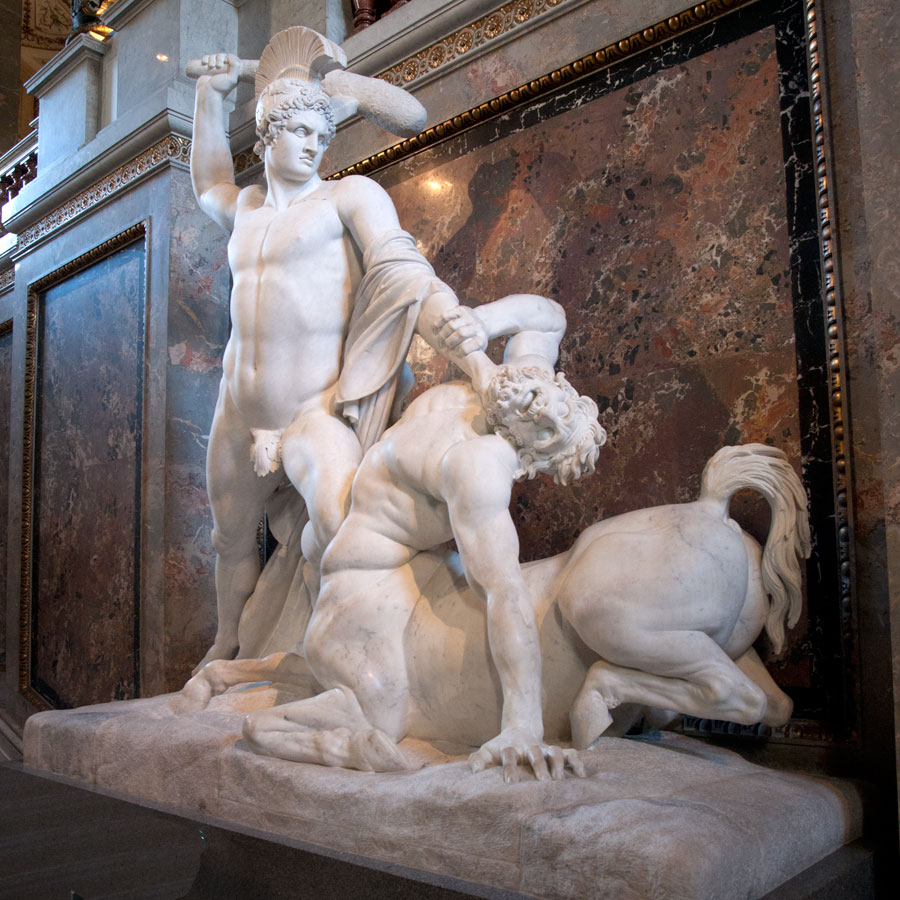 Dans la sculpture néoclassique, la violence n’est pas pour autant oubliée. Canova lui donne une dimension héroïque dans de groupes colossaux comme Thésée et le centaure